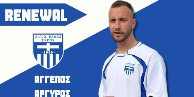 Το Διοικητικό συμβούλιο του Α.Π.Ο Ελλάς Σύρου βρίσκεται στην ευχάριστη θέση να ανακοινώσει την ανανέωση της συνεργασίας με τον ποδοσφαιριστή Άγγελο Αργυρό. Ο υψηλόσωμος στόπερ έκανε τα πρώτα του ποδοσφαιρικά βήματα στην ακαδημία του Αίαντα Σύρου. Στο παρελθόν πέρασε από τον Α.Ο Σύρου, ομάδα με την οποία πραγματοποίησε πολύ καλές εμφανίσεις. Πριν έρθει στην Ελλάς, πέρασε από το πρωτάθλημα της Γ Εθνικής φορώντας την φανέλα του Πανναξιακού. Την περσινή χρονιά αποκτήθηκε από την ομάδα μας, όπου μαζί της κατέκτησε το πρωτάθλημα Κυκλάδων. Πλέον ο Άγγελος Αργυρός θα παραμείνει αθλητής μας και τη νέα αγωνιστική σεζόν. Αρχικά του ευχόμαστε καλό καλοκαίρι και ανανεώνουμε το ραντεβού μας για την προετοιμασία του Αυγούστου.