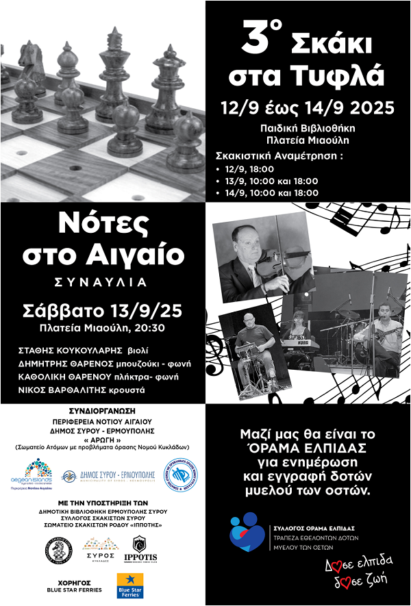 Σας περιμένουμε στο 3ο ΣΚΑΚΙ ΣΤΑ ΤΥΦΛΑ που θα πραγματοποιηθεί στην πλατεία Μιαούλη στις 12,13 και 14 Σεπτεμβρίου 2025.