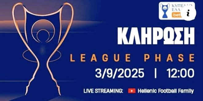 Για πρώτη φορά στην ιστορία της, η Ελληνική Ποδοσφαιρική Ομοσπονδία εισάγει την ηλεκτρονική κλήρωση σε διοργάνωσή της και συγκεκριμένα στην αυριανή της League Phase του Κυπέλλου Ελλάδας Betsson (χωρίς μπαλάκια). Τετάρτη 3 Σεπτεμβρίου, ώρα 12:00, ξενοδοχείο Grand Hyatt Athens.