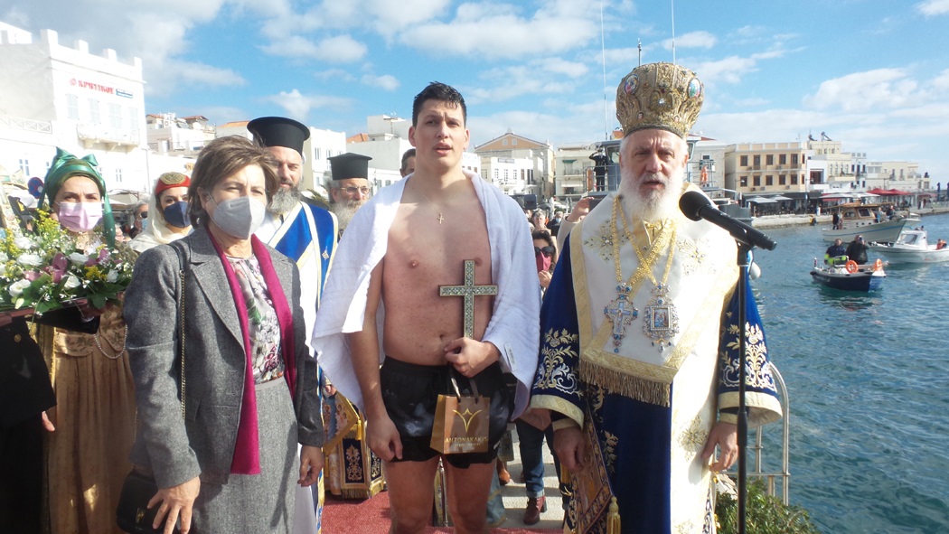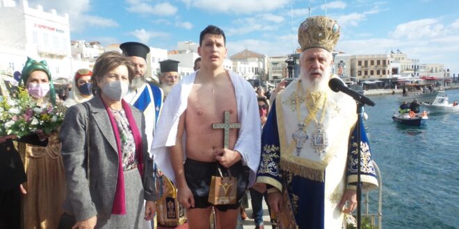 Με τη δέουσα λαμπρότητα και με την τήρηση των απαιτούμενων υγειονομικών μέτρων γιορτάστηκαν σήμερα στη Σύρο τα Θεοφάνια. Tον Τίμιο Σταυρό έπιασε ο 24χρονος ποδοσφαιριστής της Ελλάς Σύρου Μανώλης Μουλίδης, τον οποίο συνεχάρη ο Σεβασμιώτατος κ. Δωρόθεος Β.