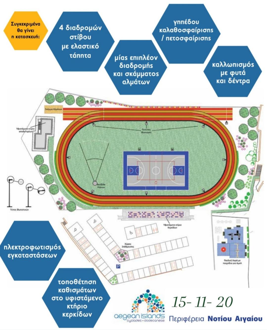 Ο προϋπολογισμός του έργου είναι 350.000 ευρώ, χρηματοδοτείται από την Περιφέρεια Νοτίου Αιγαίου και πρόκειται να χρησιμοποιηθεί κυρίως για τον κλασσικό αθλητισμό και το στίβο.