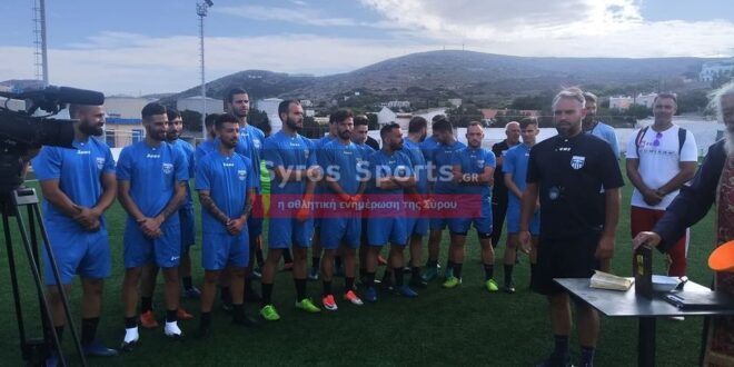 Πραγματοποιήθηκε σήμερα στο γήπεδο της ΕΠΣ Κυκλάδων στην Ερμούπολη ο καθιερωμένος ετήσιος Αγιασμός στην Ελλάς, ενόψει της νέας αγωνιστικής σεζόν. Παρουσία παικτών, προπονητών και διοίκησης, ο Πατήρ Άγγελος έδωσε και τις ευχές του στην ομάδα της Σύρου.