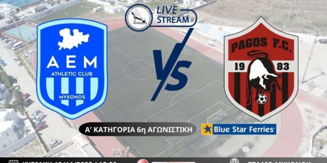 Παρακολουθήστε σε ζωντανή μετάδοση (12/11 | 15:00) από το στάδιο της Μυκόνου τον αγώνα της 6ης αγωνιστικής του 1ου ομίλου της Α’ Κατηγορίας μεταξύ της ΑΕ Μυκόνου Β και του ΑΟ Πάγου.