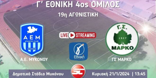 Παρακολουθήστε σε ζωντανή μετάδοση (21/1 | 13:45) από το στάδιο της Μυκόνου την αναμέτρηση της 19ης αγωνιστικής του 3ου ομίλου της Γ’ Εθνικής μεταξύ της ΑΕ Μυκόνου και του Γ.Σ. Μαρκό.