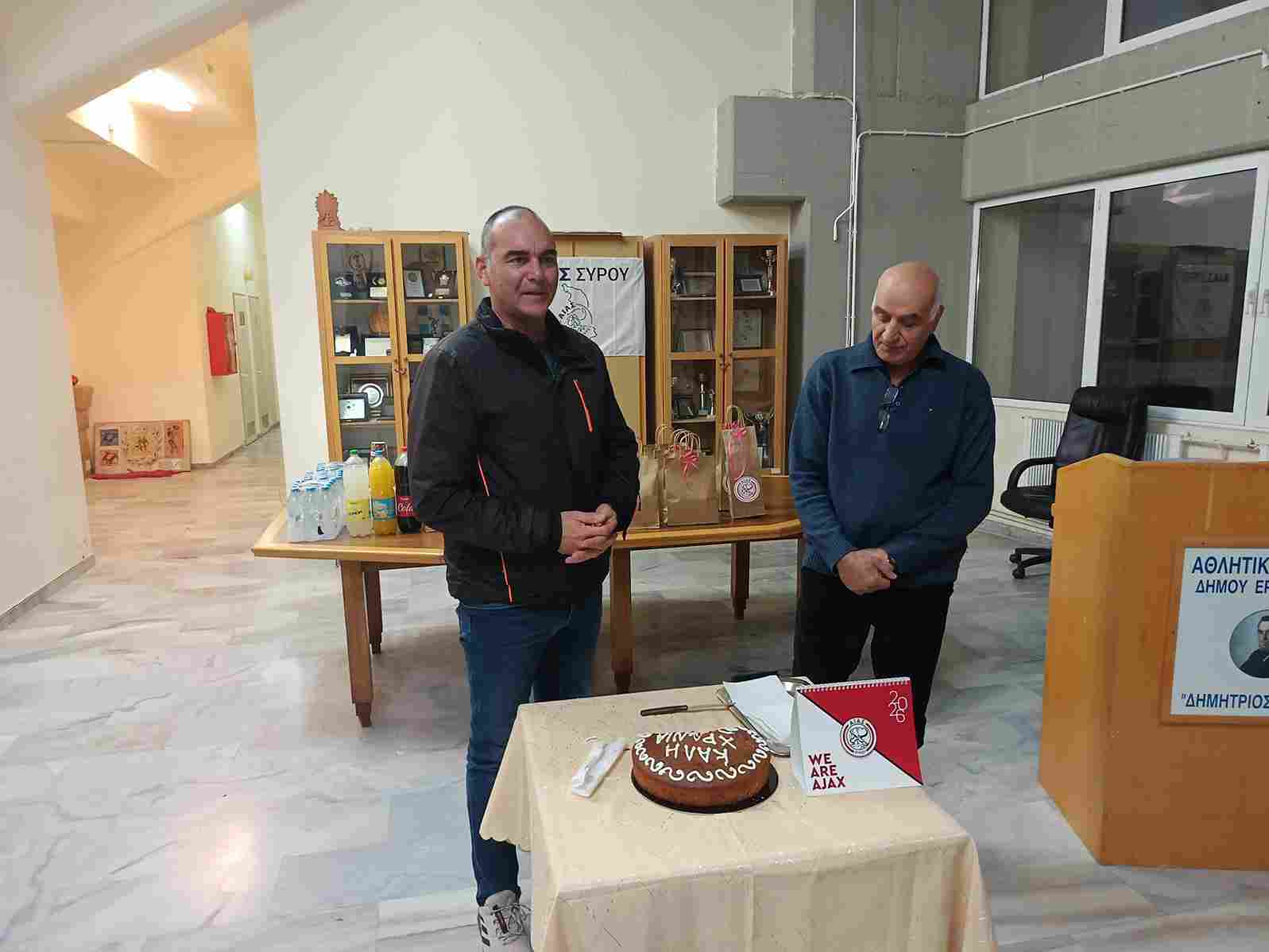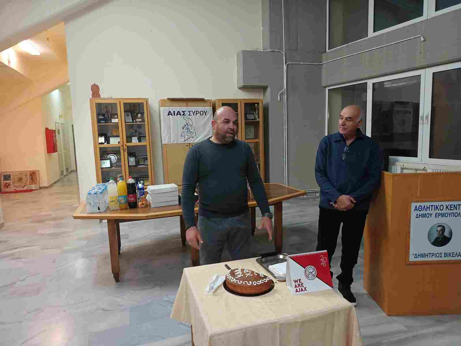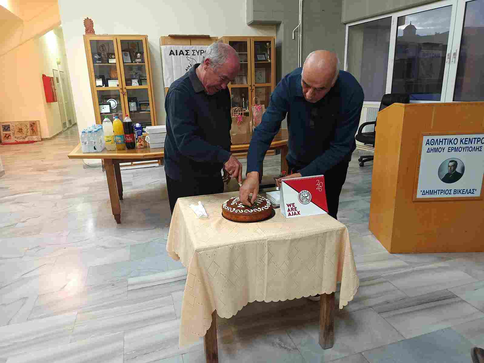 Στο φουαγιέ του Κολυμβητηρίου Δ. Βικέλας έκοψε την πίτα του το τμήμα κολύμβησης του Αίαντα Σύρου. Μέσα σε γιορτινή ατμόσφαιρα, οι αθλητές του Αίαντα, οι προπονητές (Δρακάκης-Κούτρα), ο πρόεδρος του συλλόγου Γιάννης Σκλαβούνος και ο επικεφαλής του τμήματος Κολύμβησης Δημήτρης Γρυπάρης ευχήθηκαν σε όλους χρόνια πολλά. Παράλληλα ο Δημήτρης Γρυπάρης έκανε μια ιδιαίτερη αναφορά στους χορηγούς που βοήθησαν, αλλά και το Κολυμβητήριο που επιβάλλεται να φτιαχτεί για το καλό των παιδιών.