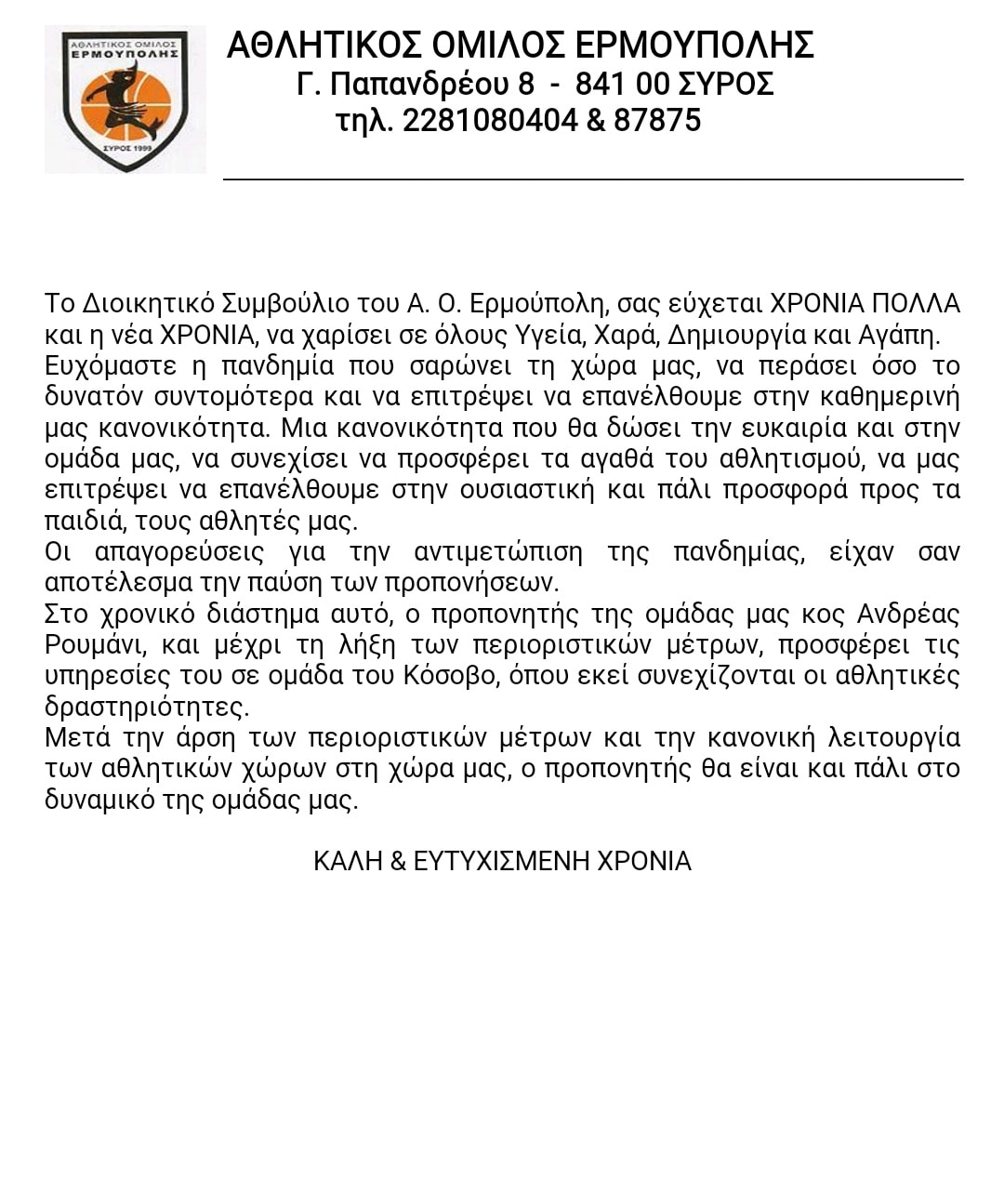 Ανακοίνωση Α.Ο Ερμούπολης… και διευκρίνηση για Ρουμάνι