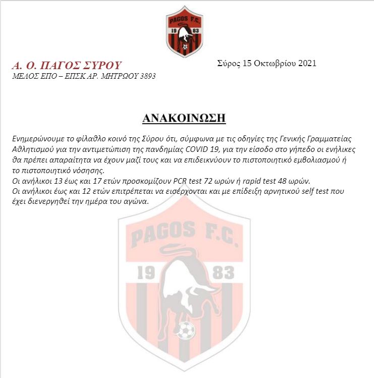 Ανακοίνωση Α.Ο Πάγου για την πρεμιέρα με την Ελλάς