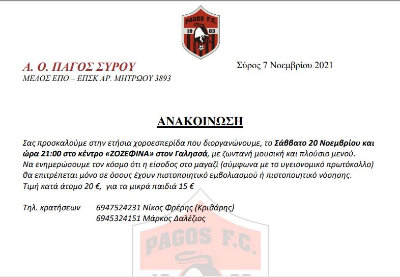 Ανακοίνωση Α.Ο Πάγου για την χοροεσπερίδα…