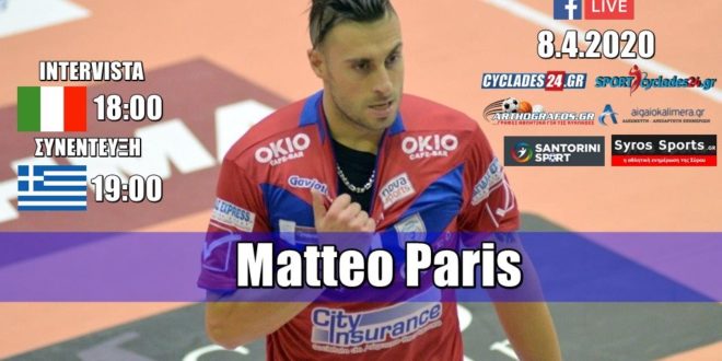 Σήμερα στις 19.00 για πρώτη φορά στη ιστορία των Κυκλαδίτικων αθλητικών MME, η απογευματινή αθλητική εκπομπή «Αρχίζει το ματς» θα έχει φιλοξενούμενο τον πρώην παίκτη του Φοίνικα Σύρου Matteo Paris, που λόγω κορονοϊού βρίσκεται στην πόλη Piacenza της Ιταλίας και θα βγει από την Πόλη του.