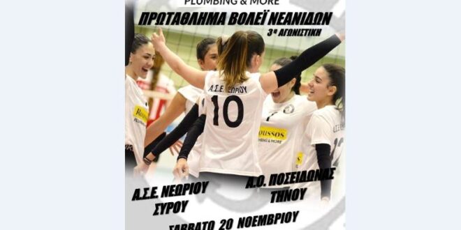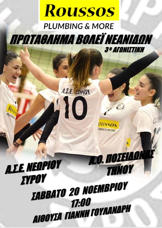 Σας προσκαλούμε να παρακολουθήσετε τον αγώνα της ομάδας μας για την 3η αγωνιστική του Πρωταθλήματος Νεανίδων με αντίπαλο τον Α.Ο.Ποσειδώνα Τήνου το Σάββατο 20 Νοεμβρίου και ώρα 17:00.
