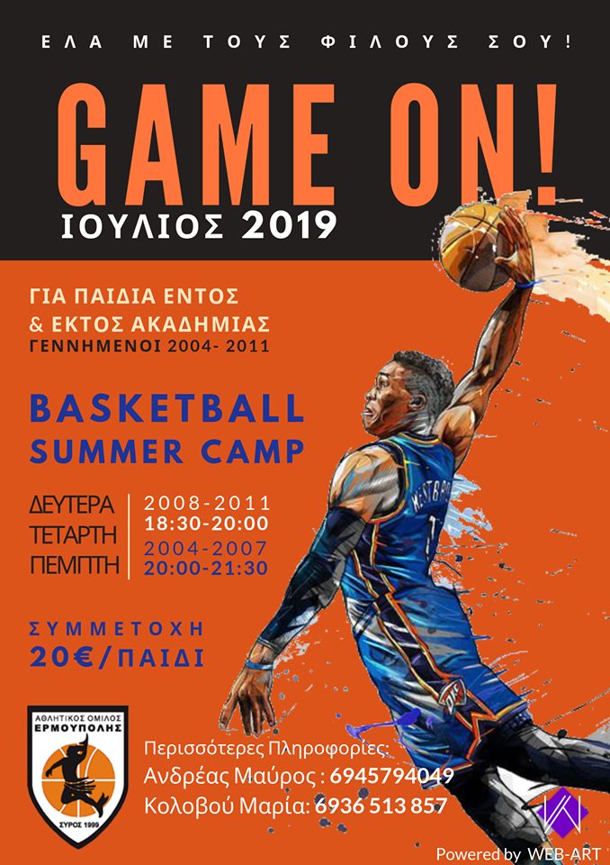Ο Α.Ο Ερμούπολης οργανώνει καλοκαιρινό Basketball Camp για παιδιά εντός και εκτός Ακαδημίας που έχουν γεννηθεί από το 2004 μέχρι το 2011 κατά την διάρκεια του Ιουλίου και τις μέρες Δευτέρα Τετάρτη και Πέμπτη από τις 18:30 έως τις 21:30.