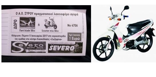 Λαχειοφόρο αγορά με «σούπερ δώρο» από τον Α.Ο Σύρου ενόψει των γιορτινών ημερών. Ο Αθλητικός όμιλος Σύρου πραγματοποιεί λαχειοφόρο αγορά, με τον τυχερό νικητή να κερδίζει ένα πανέμορφο μηχανάκι. Οι λαχνοί έχουν διατεθεί ήδη σε αρκετούς,  από τα μέλη της διοίκησης,  ενώ το επόμενο διάστημα η ομάδα θα ανακοινώσει και τα σημεία πώλησης που θα μπορούν οι ενδιαφερόμενοι να προμηθευτούν το «τυχερό» χαρτάκι.