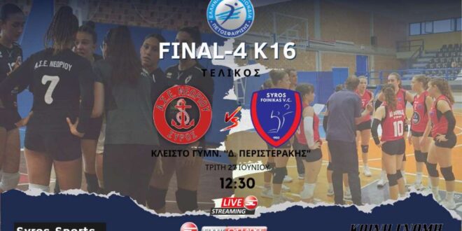 Παρακολουθήστε σε ζωντανή μετάδοση από το κλειστό γυμναστήριο ”Δ. Περιστεράκης” στη Νάξο τον Τελικό Βόλεϊ του Final – 4 της Κ16 μεταξύ του ΑΣΕ Νεωρίου και του ΑΟ Φοίνικα.