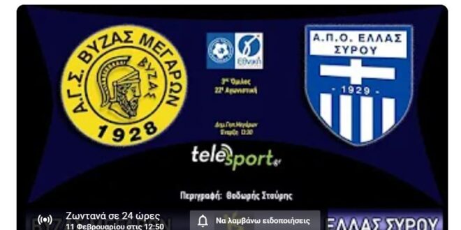 Δείτε ζωντανά σήμερα στις 13.30 τον αγώνα Βύζας Μεγάρων-Ελλάς Σύρου για την 22η αγωνιστική του πρωταθλήματος της Γ Εθνικής. Ο αγώνας είναι σε παραγωγή του TELESPORT που έχει τα τηλεοπτικά δικαιώματα του Βύζαντα.