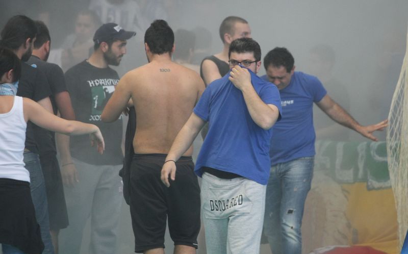 Είχε προηγηθεί ωριαία καθυστέρηση και συγκρούσεις, εκτός γηπέδου, μερίδας οπαδών του Ηρακλή με την αστυνομία, η οποία αρνείται πως έκανε χρήση χημικών. Tο κλειστό γήπεδο της Μίκρας γέμισε στη συνέχεια με καπνούς, με την αστυνομία να δηλώνει επίσημα, πως πρόκειται για χρήση πυροσβεστήρων στην είσοδο από οπαδούς. Οι παίκτες του Φοίνικα Σύρου οδηγήθηκαν στα αποδυτήρια με τον διαιτητή Γιώργο Καραμπέτσο να προειδοποιεί για διακοπή του αγώνα.