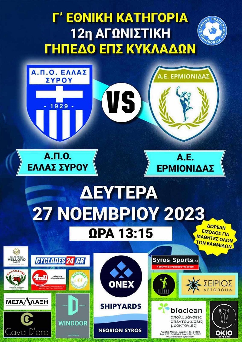 Η Ελλάς Σύρου υποδέχεται στο γήπεδο της ΕΠΣ Κυκλάδων, την Δευτέρα 27 Νοεμβρίου στη 1:15 το μεσημέρι στο πλαίσιο της 12ης αγωνιστικής της Γ’ Εθνικής κατηγορίας.