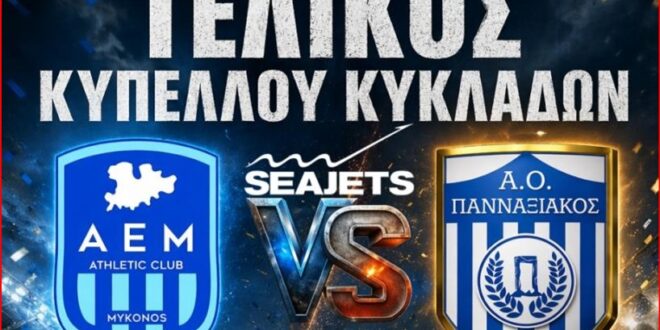 Ο 41ος τελικός του Κυπέλλου Κυκλάδων μεταξύ της Α.Ε Μυκόνου και του Πανναξιακού πλησιάζει, καθώς την Κυριακή στις 18.00 στη Σύρο θα διεξαχθεί ο τελικός του Κυπέλλου Κυκλάδων SEAJETS ανάμεσα σε Α.Ε Μυκόνου και Πανναξιακό.