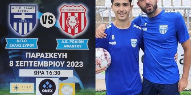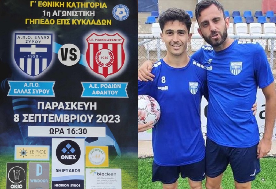 “Στο πλαίσιο της 1ης αγωνιστικής της Γ’ Εθνικής ο Α.Π.Ο ΕΛΛΑΣ Σύρου υποδέχεται στο γήπεδο της ΕΠΣ Κυκλάδων την Α.Ε. Ροδίων Αφάντου την Παρασκευή 8 Σεπτεμβρίου στις 16:30.