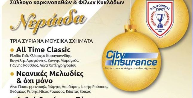 Με μεγάλη χαρά ο Α.Ο. ΦΟΙΝΙΚΑΣ σας προσκαλεί στη Μουσική Βραδιά Αγάπης που διοργανώνει σε συνεργασία με το μεγάλο του Χορηγό, την εταιρεία CITΥ INSURANCE, για την ενίσχυση των συλλόγων Σύλλογος Παροχής Φροντίδας και Κατ’ Οίκον Νοσηλείας Σύρου και Σύλλογος Καρκινοπαθών & Φίλων Κυκλάδων.