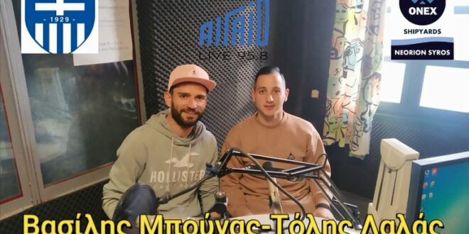 Βασίλης Μπούνας και Τόλης Λαλάς βρέθηκαν σήμερα στο στούντιο του Αιγαίο LIVE 95.8 καλεσμένοι του Μάκη Πρίντεζη και Έλπη Φρέρη στην ραδιοφωνική εκπομπή«Στο VAR». Οι δυο ποδοσφαιριστές μίλησαν για όσα έγιναν στο ντέρμπι με την Α.Ε Πάρου, απαντώντας παράλληλα στα όσα κατήγγειλε ο προπονητής της Παριανής ομάδας Γιώργος Μοστράτος. Παράλληλα οι δυο αθλητές ευχαρίστησαν τους χορηγούς της Ελλάς Σύρου που βρίσκονται στο πλευρό της ομάδας, αναφέρθηκαν στην διοίκηση και τους Ζιάβρα-Πύργο που λειτουργούν το σύλλογο σε επαγγελματικά πρότυπα.