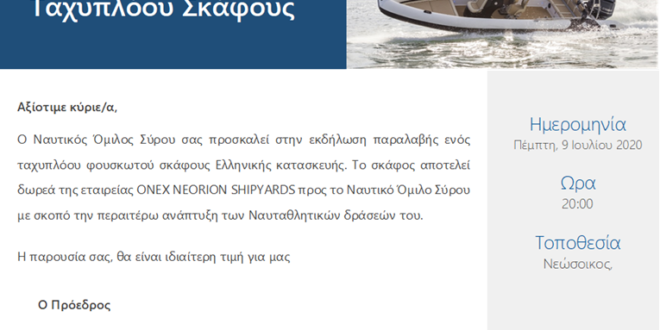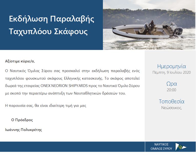 O Ναυτικός όμιλος σας προσκαλεί στην εκδήλωση παραλαβής ενός φουσκωτού…