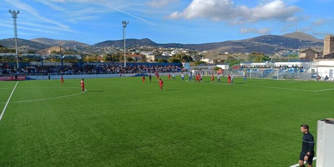 Οι Συριανοί μπήκαν με ορμή στο παιχνίδι και μόλις στο 7′ ο Ζαφείρης με δυνατό σουτ από τα 30 μέτρα έστειλε τη μπάλα στο οριζόντιο δοκάρι του Αγριμάκη.