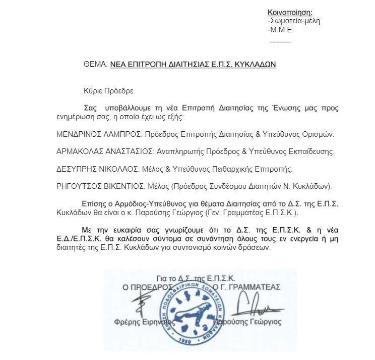 Η ΕΠΣ Κυκλάδων με ανακοίνωση της γνωστοποίησε τη νέα επιτροπή μετά την παραίτηση του κ. Σουλτάνη.