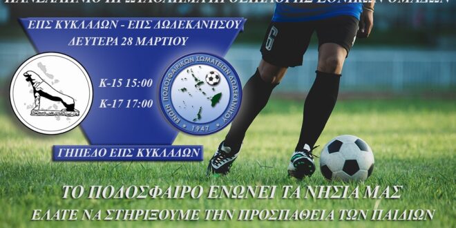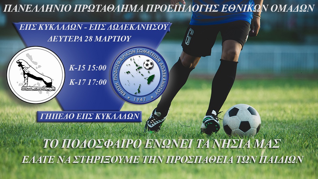 Η ώρα για την Μικτή Κυκλάδων έφτασε. Αύριο Δευτέρα (28/3) στις 15.00 και 17.00 η Μικτή Κυκλάδων θα δώσει τα πρώτα της παιχνίδια στο πλαίσιο των αγώνων προεπιλογής Εθνικών ομάδων… Στις 15.00 για το Κ15 η ομάδα μας θα φιλοξενήσει στο γήπεδο της ΕΠΣΚ την ΕΠΣ Δωδεκανήσου. Δυο ώρες αργότερα η ομάδα Κ17 των Κυκλάδων θα αντιμετωπίσει την αντίστοιχη ομάδα των Δωδεκανήσων στο πλαίσιο της 2ης αγωνιστικής.