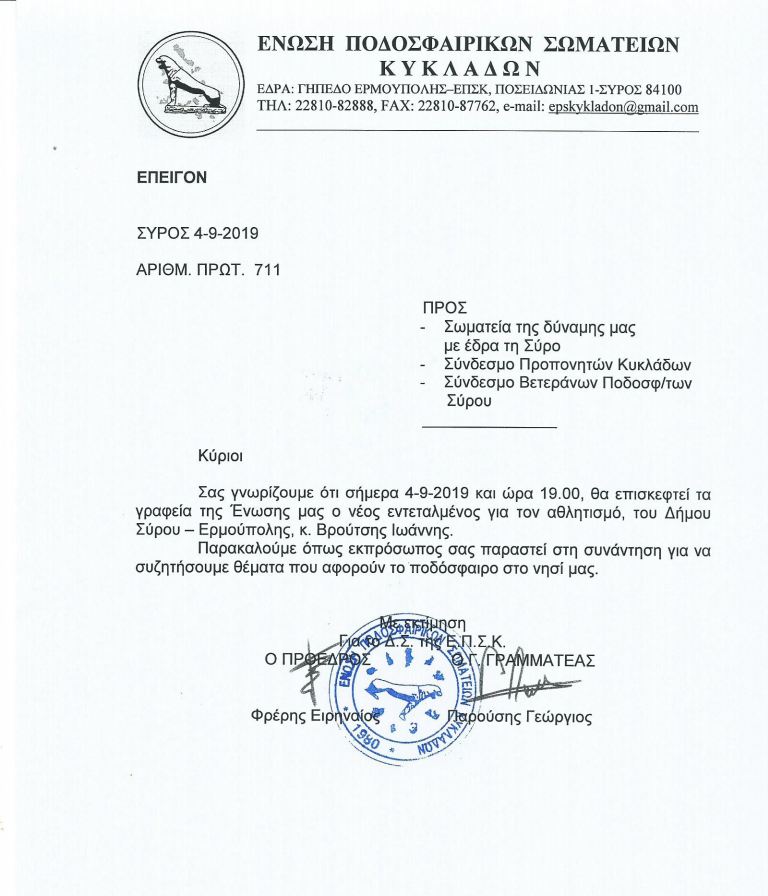 Μέσα από δελτίο τύπου της, η ΕΠΣ Κυκλάδων ενημερώνει για την επίσκεψη του εντεταλμένου για τον αθλητισμό του Δήμου Σύρου-Ερμούπολης κ. Ιωάννης Βρούτση στα γραφεία της…