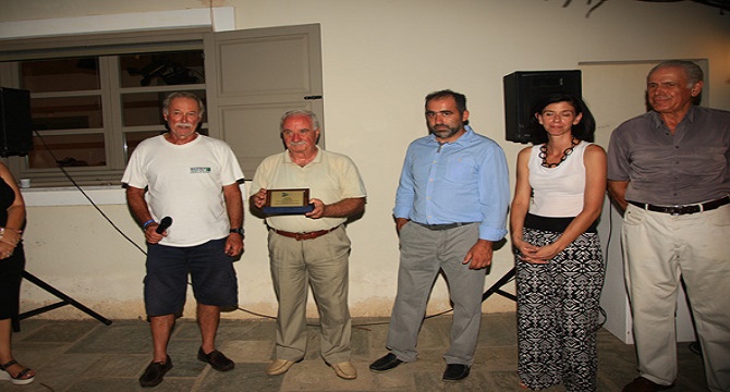 Ο έφορος Ανοικτής Θαλάσσης του ΝΟΤΚ, Αλέξανδρος Θεοδωρίδης απονέμει τιμητική πλακέτα στο Δήμαρχο Κέας, Ιωάννη Ευαγγέλου.