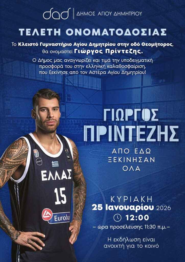 Την Κυριακή 25 Ιανουαρίου 2026, στις 12:00, θα πραγματοποιηθεί η τελετή ονοματοδοσίας του Κλειστού Γυμναστηρίου Αγίου Δημητρίου, το οποίο θα φέρει πλέον το όνομα «Κλειστό Γυμναστήριο Αγίου Δημητρίου – Γιώργος Πρίντεζης». Ώρα προσέλευσης 11.30 π.μ..