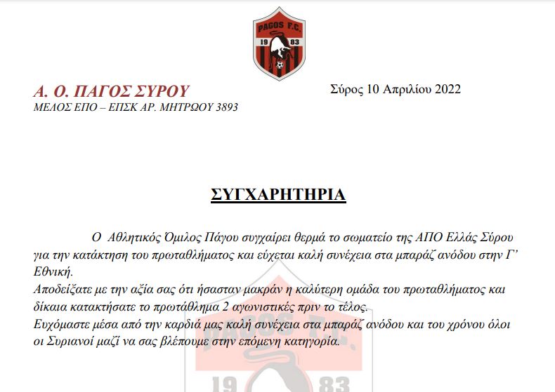 Με ανακοίνωση του ο Α.Ο Πάγου εκφράζει τα συγχαρητήρια του στην Ελλάς Σύρου για την κατάκτηση του φετινού πρωταθλήματος Κυκλάδων…