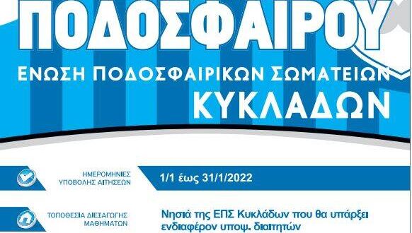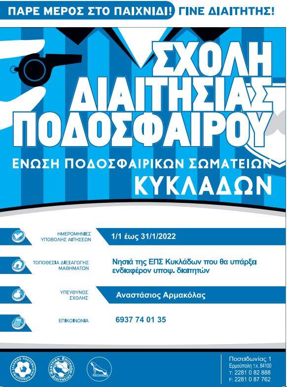 Η ΕΠΣ Κυκλάδων σε συνεργασία με την ΕΠΟ, αλλά και την επιτροπή διαιτησίας της ΕΠΣ Κυκλάδων θα δώσει την ευκαιρία σε αρκετούς νέους να γίνουν διαιτητές, καθώς διοργανώνει σχολές διαιτησίας σε όλα τα νησιά…