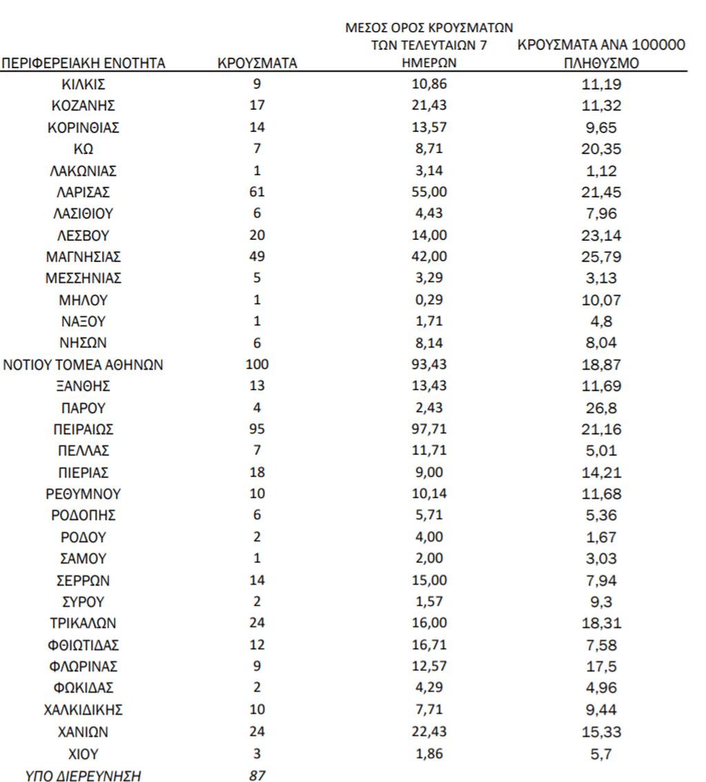 Τα νέα εργαστηριακά επιβεβαιωμένα κρούσματα της νόσου που καταγράφηκαν τις τελευταίες 24 ώρες είναι 1.957, εκ των οποίων 2 εντοπίστηκαν κατόπιν ελέγχων στις πύλες εισόδου της χώρας. Ο συνολικός αριθμός των κρουσμάτων ανέρχεται σε 375.831