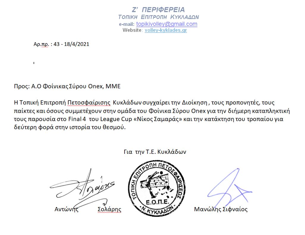 Η Τοπική Επιτροπή Πετοσφαίρισης Κυκλάδων συγχαίρει την Διοίκηση , τους προπονητές, τους παίκτες και όσους συμμετέχουν στην ομάδα του Φοίνικα Σύρου Onex για την διήμερη καταπληκτική τους παρουσία στο Final 4 του League Cup «Νίκος Σαμαράς» και την κατάκτηση του τροπαίου για δεύτερη φορά στην ιστορία του θεσμού.