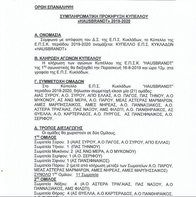 Μέσω κάποιων μικρών αλλαγών, η ΕΠΣ Κυκλάδων στέλνει ξανά την συμπληρωματική προκήρυξη, για το Κύπελλο Κυκλάδων για την σεζόν 2019-2020 .