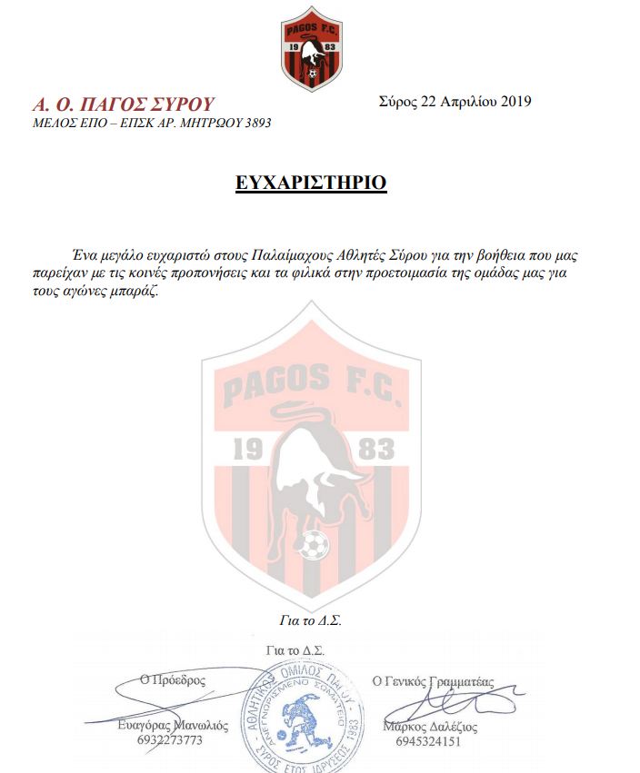 Το ευχαριστώ του Α.Ο Πάγου σε Παλαίμαχους ποδοσφαιριστές Σύρου…