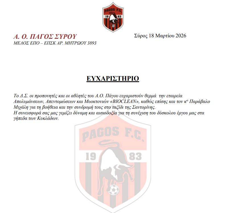 Το ευχαριστώ του Α.Ο Πάγου στη Bioclean που έρχεται μέσα από ανακοίνωση της ομάδας..