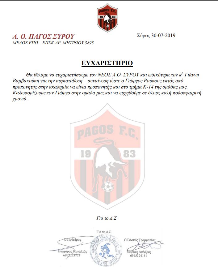 Το ευχαριστώ του Πάγου σε ακαδημία Νέου Α.Ο.Σ και Γιάννη Βαμβακούση