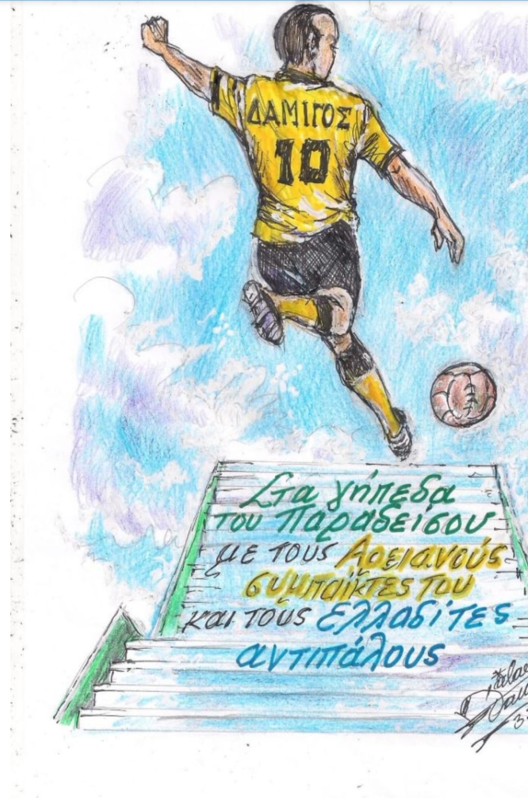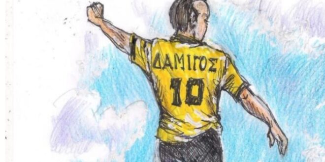 Η Ελλάς Σύρου δημοσίευσε στα μέσα κοινωνικής δικτύωσης σκίτσο που απεικονίζει τον Μιχάλη Δαμίγο με την φανέλα του Άρη Σύρου, γράφοντας από κάτω χαρακτηριστικά: “Στα γήπεδα του παραδείσου με τους Αρειανούς συμπαίκτες του και τους Ελλαδίτες αντιπάλους”.