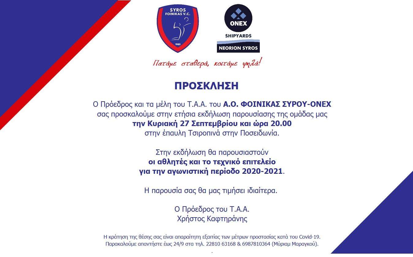 Μέσω ανακοίνωσής του ο Φοίνικας Σύρου ONEX γνωστοποιεί πως την Κυριακή 27 Σεπτεμβρίου θα παρουσιαστούν οι αθλητές και το τεχνικό επιτελείο της ομάδας, για την φετινή σεζόν.