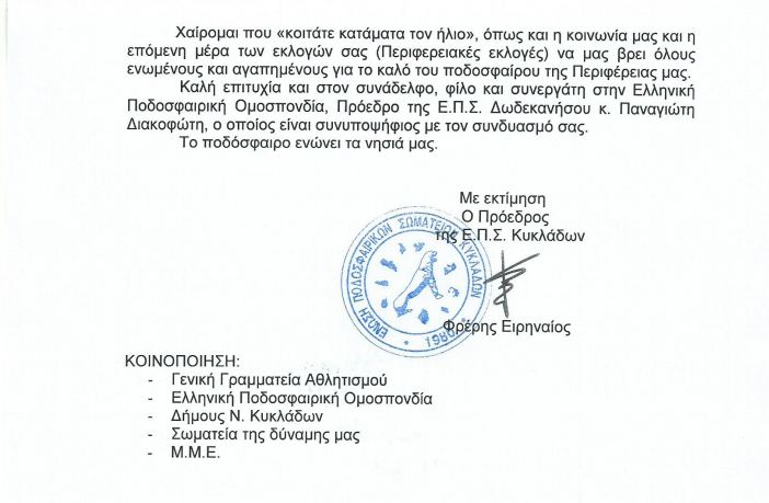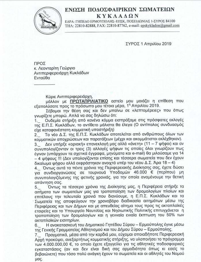 Με επιστολή του ο πρόεδρος της ΕΠΣ Κυκλάδων δίνει την δική του απάντηση στην επιστολή που έστειλε ο Αντιπεριφερειάρχης κ. Γιώργος Λεονταρίτης….