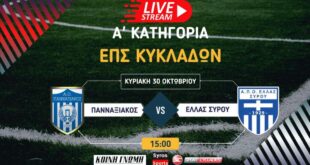 Πανναξιακός-Ελλάς Σύρου Live Streaming Παρακολουθήστε σε ζωντανή μετάδοση από το ΔΑΚ Νάξου την αναμέτρηση της 2ης αγωνιστικής της Α’ κατηγορίας της ΕΠΣ Κυκλάδων μεταξύ του Πανναξιακού και της Ελλάς Σύρου. Ευχαριστούμε πολύ το Sportcyclades και τον Σπύρο Μάκαρη που παρά το γεγονός ότι δεν υπήρξε χορηγική στήριξη από την Σύρο, …