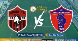 Πάγος-Θύελλα Καμαρίου Live Streaming (18.30) Τον αγώνα για την Σύρο προσφέρει η εταιρία Κριθάρης του προέδρου Νίκου Φρέρη. Παρακολουθήστε σε ζωντανή μετάδοση (24/2 | 18:30) από το γήπεδο της ΕΠΣ Κυκλάδων την αναμέτρηση για την Β΄φάση του πρωταθλήματος της Α΄Κατηγορίας ΕΠΣ Κυκλάδων μεταξύ του ΑΟ Πάγου και της Θύελλας Καμαρίου.