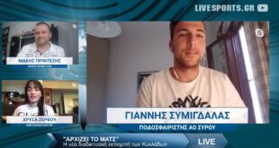 Η εκπομπή Αρχίζει το ματς με Γιάννη Συμιγδαλά (Βίντεο) Πολύ ενδιαφέρουσα ήταν η σημερινή εκπομπή «Αρχίζει το ματς» εμ καλεσμένο τον ποδοσφαιριστή του Α.Ο Σύρου Γιάννη Συμιγδαλά. Θυμίζουμε πως η εκπομπή μεταδίδεται καθημερινά (19.00-20.00) και είναι μία συμπαραγωγή του, SantoriniSport.gr με τα,Syros-Sports.gr, Sportcyclades24.gr, Cyclades24.gr, Aigaiokalimera.gr, Arthografos.gr και livesports.gr, tinostoday.gr και …