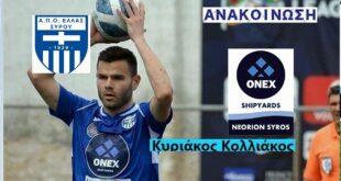 Κάτοικος Σύρου… και παίκτης της Ελλάς και τη νέα χρονιά ο Κολλιάκος «Το Διοικητικό συμβούλιο του Α.Π.Ο Ελλάς Σύρου ανακοινώνει την ανανέωση της συνεργασίας με τον ποδοσφαιριστή Κυριάκο Κολλιάκο. Ο 27χρονος ποδοσφαιριστής αγωνίζεται στην θέση του αριστερού μπακ. Έχοντας περάσει από ομάδες όπως οι Ατρόμητος (ακαδημίες), Κηφισιά, Άγιος Ιερόθεος (Πρωταθλητής …