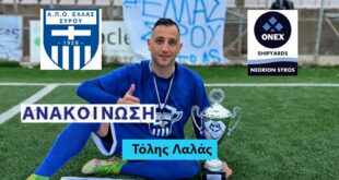 Ανανέωσε με την Ελλάς και ο Τόλης Λαλάς Και τη νέα σεζόν στην Ελλάς Σύρου θα βρίσκεται ο Τόλης Λαλάς που ανακοινώθηκε επίσημα από την ομάδα της Σύρου. Αναλυτικά η ανακοίνωση αναφέρει: Το Δ.Σ του Α.Π.Ο Ελλάς Σύρου βρίσκεται στην ευχάριστη θέση να ανακοινώσει την ανανέωση της συνεργασίας με τον …