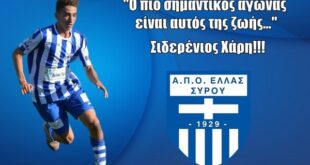 Ελλάς Σύρου: «Χάρη θα είμαστε στο πλευρό σου» Ο Χάρης Παράβαλος υποβλήθηκε σε σοβαρή χειρουργική επέμβαση και ο ΑΠΟ ΕΛΛΑΣ Σύρου του εύχεται ταχεία ανάρρωση. Η ανακοίνωση του ΑΠΟ ΕΛΛΑΣ ΣΥΡΟΥ: Το Διοικητικό Συμβούλιο, το τεχνικό επιτελείο και οι ποδοσφαιριστές του ΑΠΟ ΕΛΛΑΣ Σύρου εύχονται ολόψυχα ταχεία ανάρρωση και περαστικά …