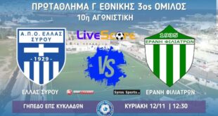 Read More »Ελλάς Σύρου – Εράνη Φιλιατρών: Live Score (12.30)
