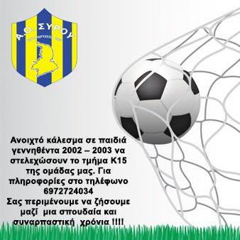 Ανοιχτό κάλεσμα σε παιδιά γεννηθέντα 2002-2003 να στελεχώσουν την ομάδα Κ15 από τα τμήματα υποδομών του Α.Ο Σύρου…